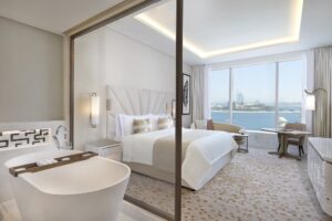 يُجسّد فندق سانت ريجيس دبي – النخلة قمّة الفخامة في قلب جزيرة النخلة، حيث وصفه موقع “إندبندنت” الاخباري البريطاني بأنه “قطعة من نيويورك في قلب نخلة جميرا”، مستوحياً تصميمه الأنيق من فندق “سانت ريجيس نيويورك” الشهير.