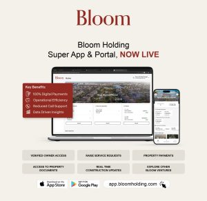 وتقدّم بلووم القابضة كلاً من تطبيق بلووم بارتنرز Bloom Partners وبلووم كوميونيتي Bloom Community وبلووم سوبر Bloom Holding Super App، والتي تم تصميمها لتوفير تجارب رقمية مترابطة وسلسة وفعّالة تغطي مختلف مراحل التملك العقاري والحياة في مجتمعات بلووم السكنية.