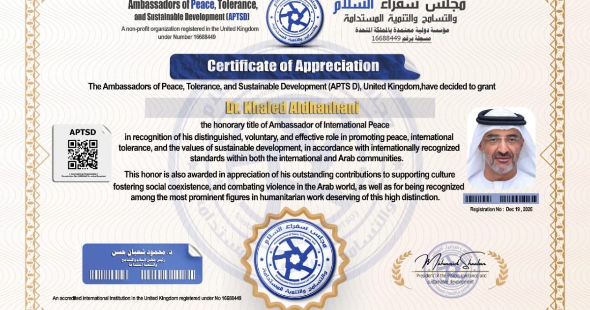 دبي، 30 ديسمبر 2025 – منح مجلس سفراء السلام والتسامح والتنمية المستدامة بالمملكة المتحدة، الدكتور الخبير خالد الظنحاني لقب “سفير السلام الدولي” من الطبقة الأولى، تقديرًا لإسهاماته الفكرية والمجتمعية، ودوره المؤثر في ترسيخ قيم السلام والتسامح والحوار الإنساني على المستويين العربي والدولي.