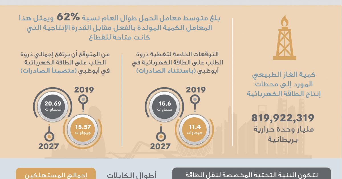 أما في قطاع الكهرباء فقد بلغ إجمالي الطلب على الطاقة الكهربائية ضمن شبكة أبوظبي ذروته خلال العام 2018 في تاريخ 11 يوليو؛ بمستوى 11,080 ميجاواط مرتفعاً بنسبة 1.9% عن العام الذي سبقه حيث بلغ حينها 10,876 ميجاواط، كما شهد نفس التاريخ أعلى إجمالي للطلب على الكهرباء لعام 2018 حيث بلغ 15,125 ميجاواط، متضمناً التصدير خارج الامارة مرتفعاً بنسبة 2.3% مقارنة بالعام الذي سبقه حيث بلغ 14,788. وحسب التقرير فقد بلغ إنتاج القطاع من الكهرباء 84,182 جيجاوات ساعة من الكهرباء، مرتفعا بنسبة 1.4% مقارنة بالعام السابق بينما بلغت القدرة الإنتاجية المتاحة لأصول إنتاج الكهرباء في أبوظبي 16,622 ميجاواط.