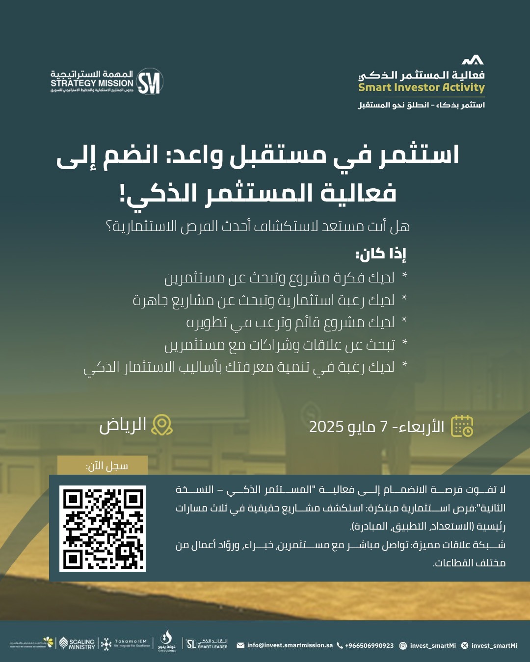 متابعة القراءةاستثمر في مستقبل واعد: انضم إلى فعالية المستثمر الذكي! تفاصيل الفعالية الرسمية 👇 📍 الرياض – 7 مايو 2025 هل أنت مستعد لاستكشاف أحدث الفرص الاستثمارية؟ لا تفوت فرصة الانضمام إلى فعالية "المستثمر الذكي – النسخة الثانية": 💡 فرص استثمارية مبتكرة: استكشف مشاريع حقيقية في ثلاث مسارات رئيسية (الاستعداد، التطبيق،