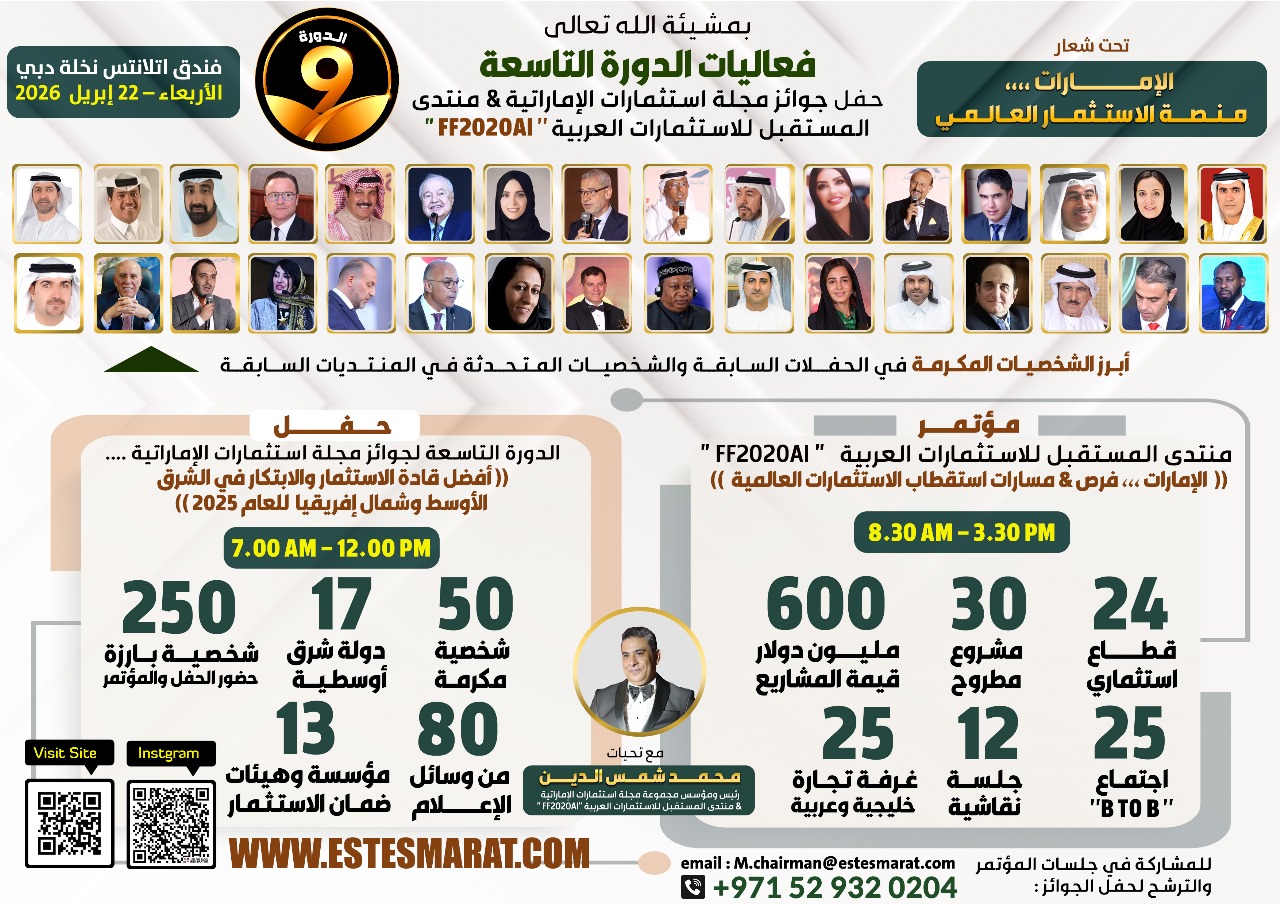 متابعة القراءة المؤتمر يشهد عدد 5 جلسات نقاشية و25 متحدث وحضور غرف تجارة خليجية وعربية وهيئات ضمان الاستثمار تكريم 50 شخصية بارزة من 25 دولة في المنطقة والعالم بجوائز المجلة بفندق اتلانتس نخلة دبي عرض 30 مشروع استثماري واعد وتعزيز خيارات الاستحواذ للاستثمارات الناشئة الاحتفاء بأفضل المشاريع المبتكرة