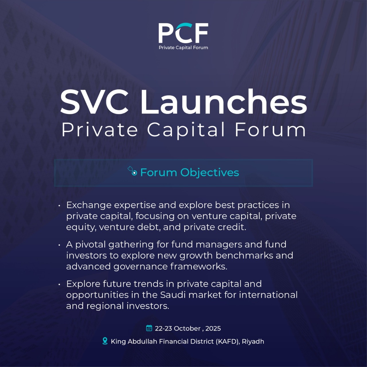 The Saudi Venture Capital Company (SVC) has announced the launch of the "Private Capital Forum 2025", which is the first forum of its kind in Saudi Arabia that focuses on private capital (venture capital, private equity, venture debt, and private credit). The forum is scheduled for October 22-23, 2025, at