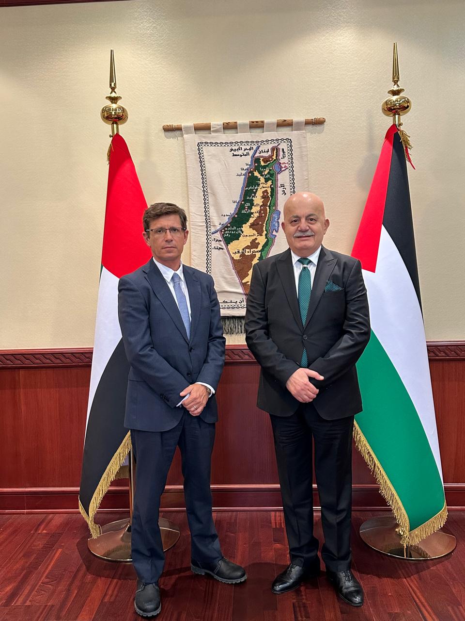 استقبل السفير علي يونس القائم بأعمال سفارة دولة فلسطين لدى دولة الإمارات العربية المتحدة سفير مملكة إسبانيا لدى دولة الإمارات العربية المتحدة إيميليو بين جودوس، في أبوظبي. أطلع السفير يونس، السفير بين جودوس ، على الأوضاع داخل الأراضي الفلسطينية، في ضوء تصاعد اعتداءات قوات الاحتلال ضد أبناء شعبنا الفلسطيني في