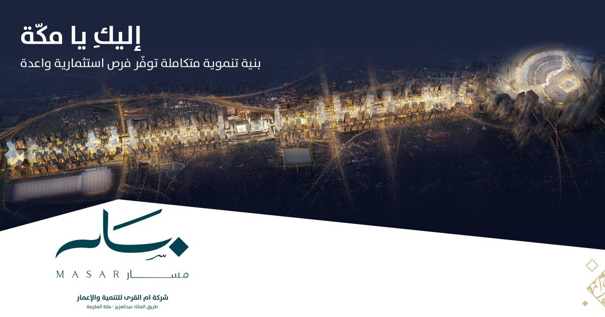 كشفت شركة أم القرى للتنمية والإعمار عن وجهتها الجديدة “مسار” تحت شعار “إليكِ يا مكة”. وجاءت فكرة هوية وجهة “مسار” – والتي يعتبر طريق الملك عبد العزيز بمكة نواتها الرئيسة – لتعبّر عن مفهوم الحركة الشاملة الذي تعتمد عليه باحتوائها على عدة مسارات ومنها مسار للمشاة بطول 3,650 متراً، والذي يفصل بين اتجاهي المسار الرئيسي لحركة المركبات بعرض 80 متراً، ولا يتقاطع معه، ليمثّل الامتداد الطبيعي لساحات الحرم المكي الشريف، وكما تشتمل الوجهة على مسارات أخرى مثل مسار الحافلات الترددية ومسار مترو مكة.